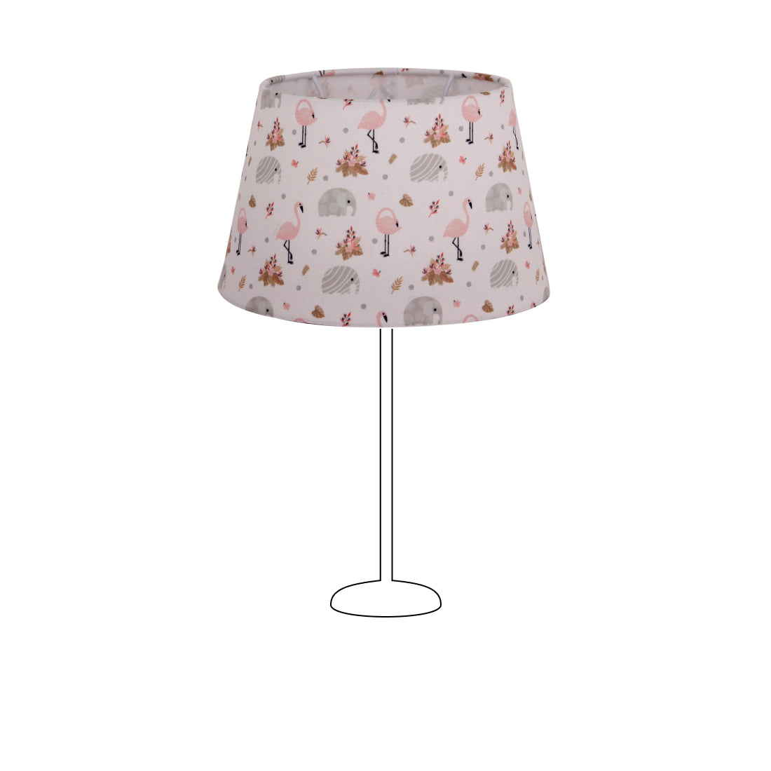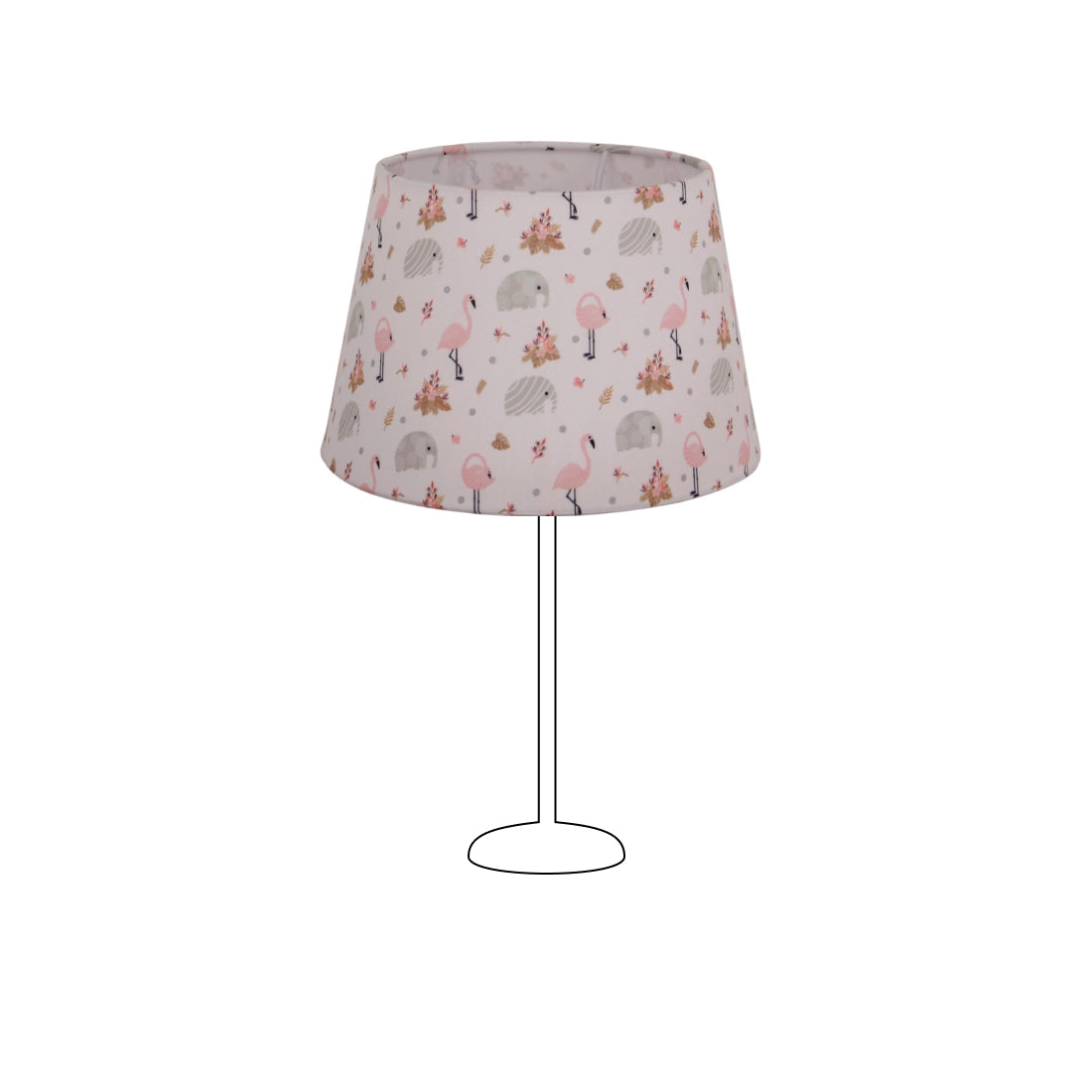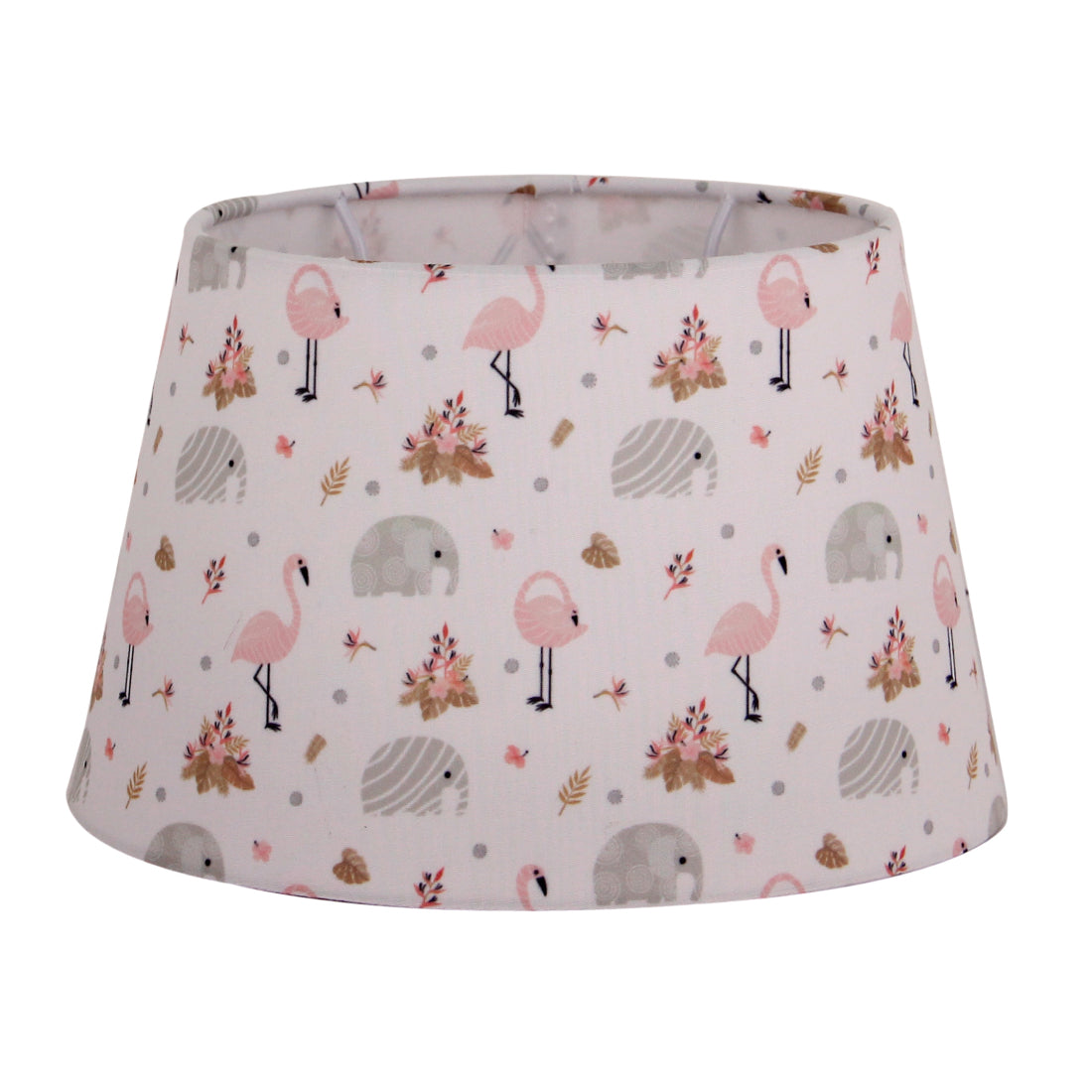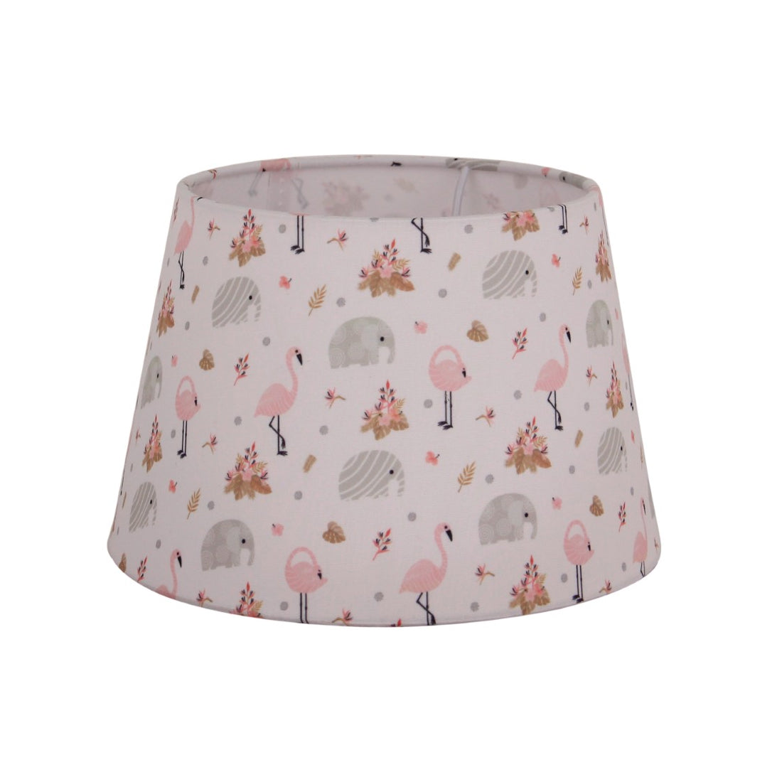 Moderner Drum-Rund Lampenschirm mit niedlichem Zoo-Motiv, verziert mit Flamingos, kleinen Elefanten und floralen Details. Der hochwertige Stoff in sanften Pastellfarben sorgt für ein warmes Licht und ist ideal für Kinderzimmer, Babyzimmer und Spielbereiche.