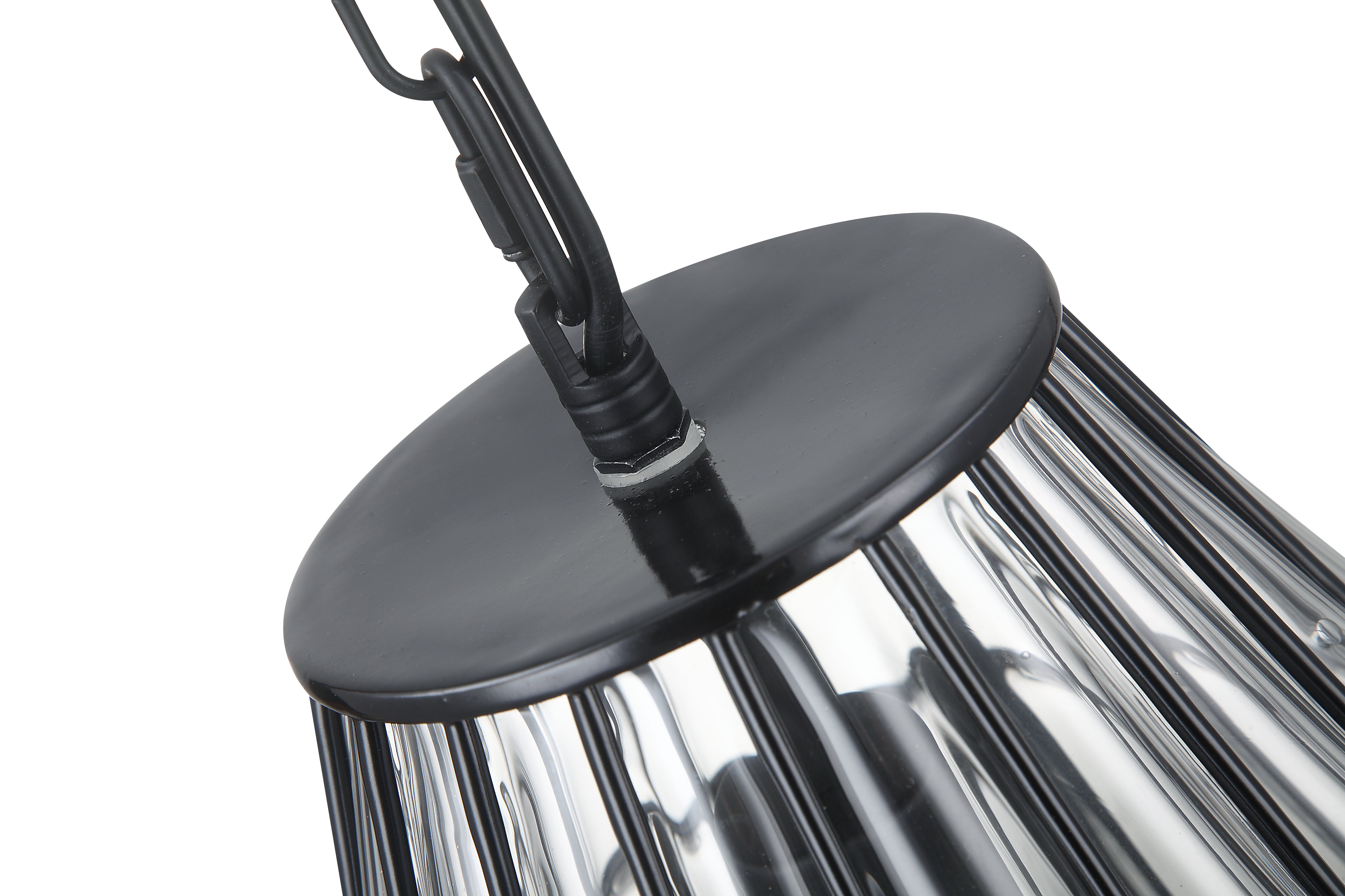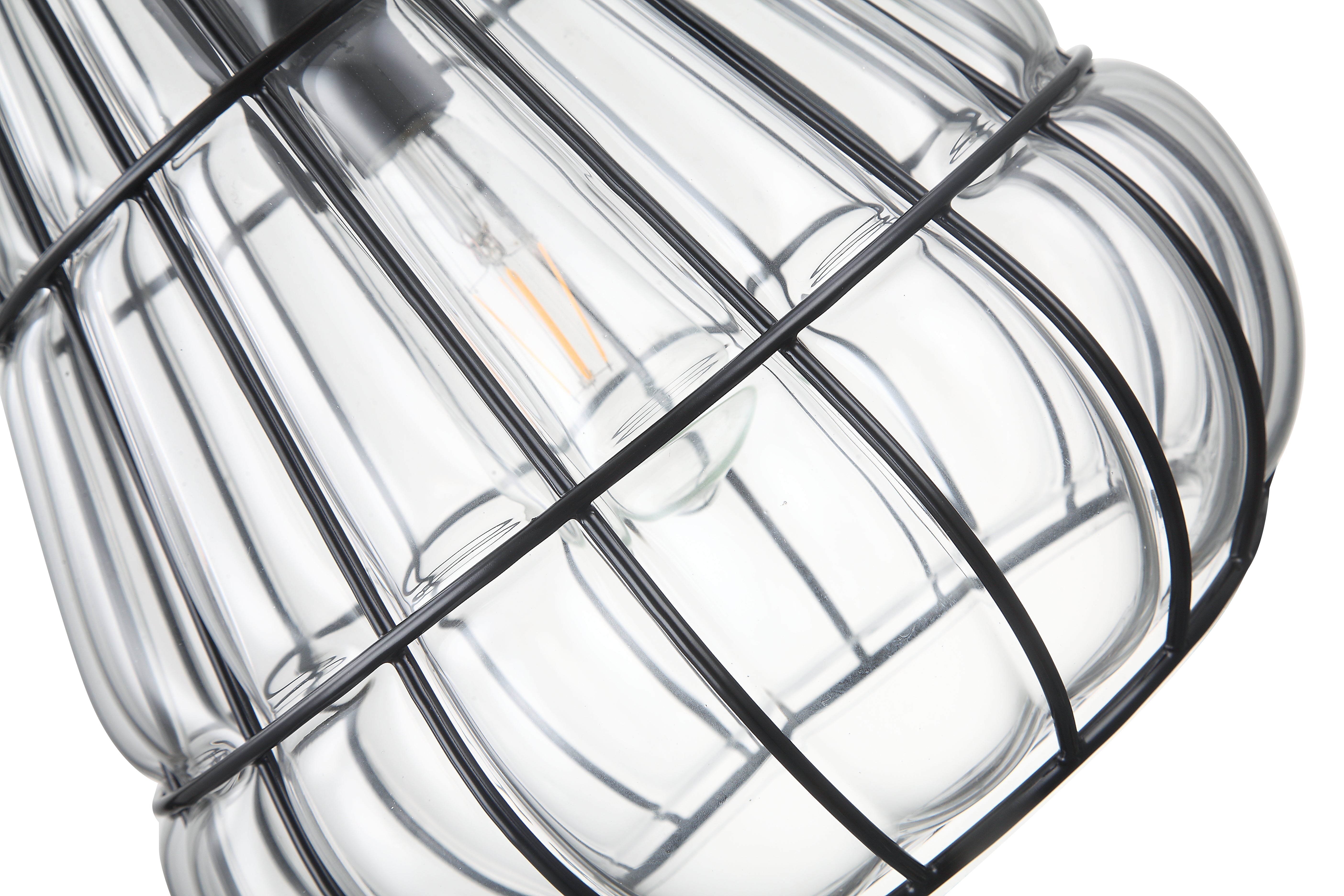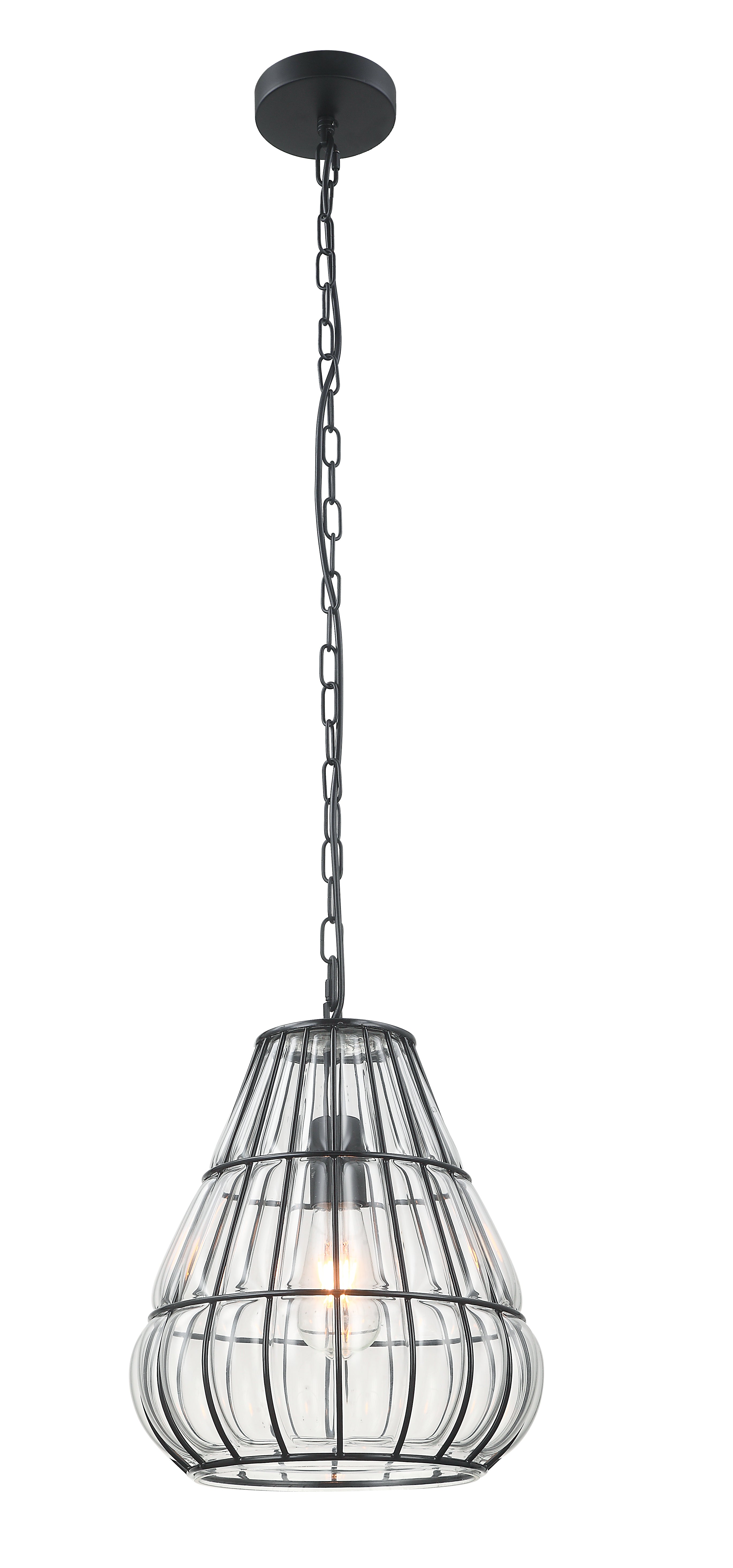 Elegante Hängelampe aus schwarzem Metall mit klarem Glas. Eingeschaltet zaubert sie ein besonderes Flammenspiel an Wand und Decke.